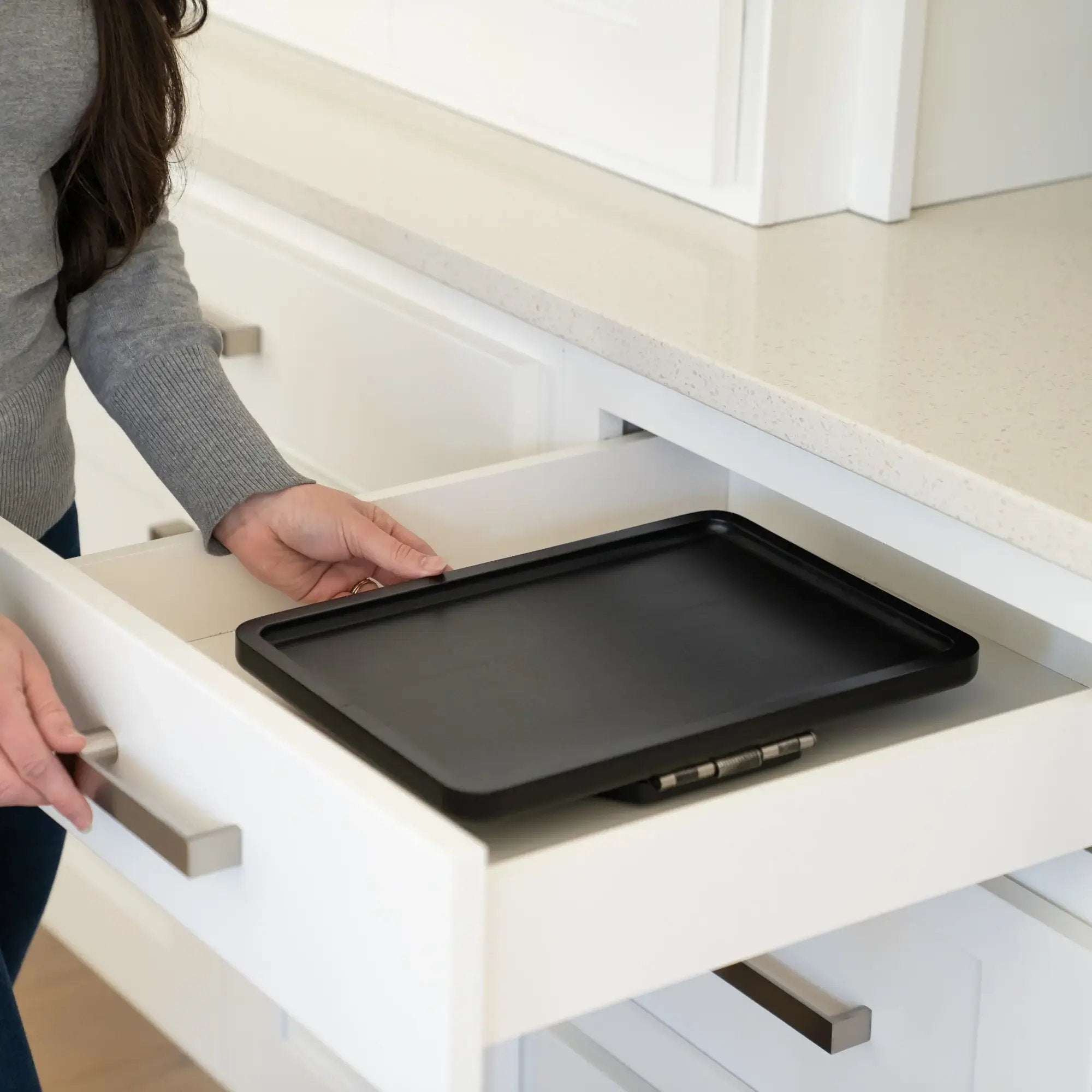 This tray worked out well! The size was perfect and I love the color. It stays on perfectly with its grip handles. I'm definitely happy with it!